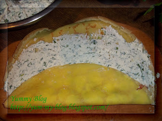 3. Заворачиваю начинку в блины. На разложенный блин наношу небольшим слоем творожную массу. Немного отойдя от центра блина выкладываю полоской нарезанное филе форели.
